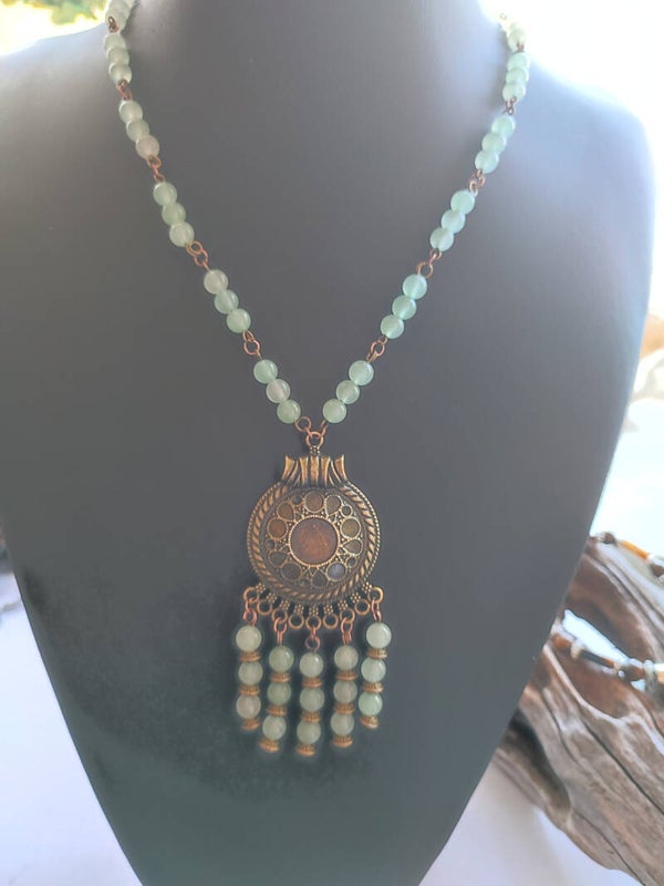 Green Adventurine and Brass Necklace/Pendant, handcrafted with 6mm Green Adventurine Beads, the brass pendant measures 9cm from the top of the bale to the bottom of the tassel beads. The brass disk is 3.8cm across. The beaded necklace is 50cm.