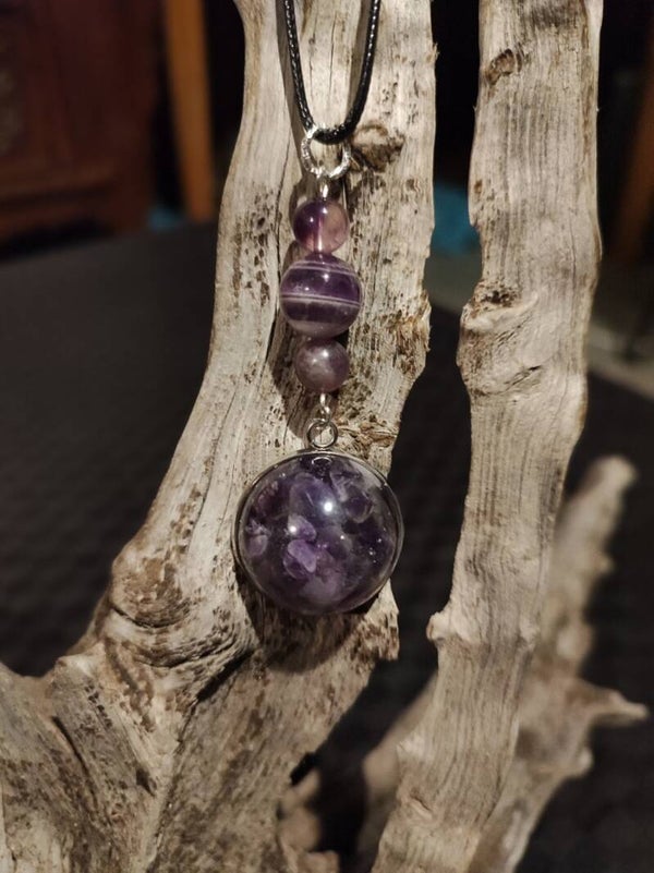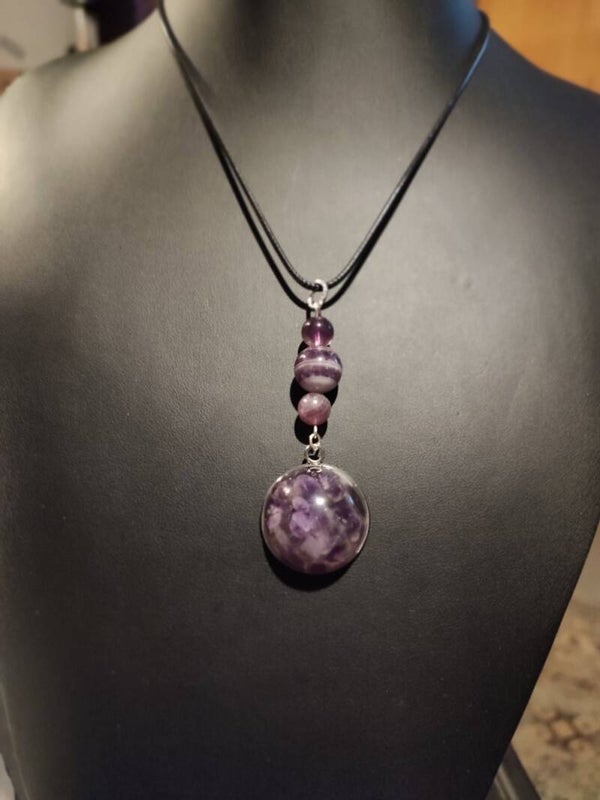 Lovely Amethyst Necklace, the cabochon is made from natural Amethyst stones, set in resin with a stainless steel backing, above this are 2x 8mm & 1 12mm Amethyst Beads, comes with a 43cm black cord
