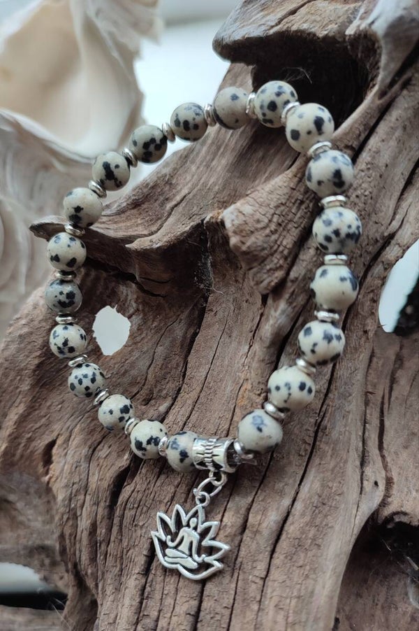 Handcrafted with 8mm Natural Dalmation stone beads, with metal spacers and a Buddha charm, it is elasticised.