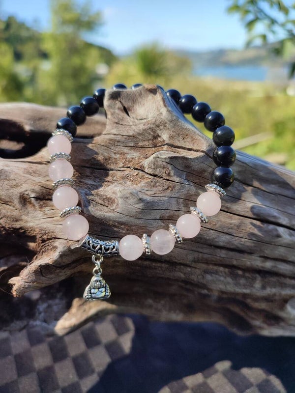 Rose Quartz & Black Onyx Bracelet 8mm (Buddha charm)