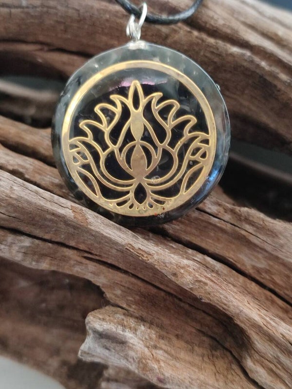Handcrafted with Black Onyx stone chips, bound together with resin, gold coloured Lotus.