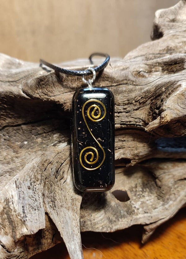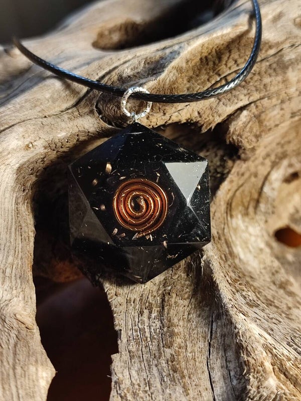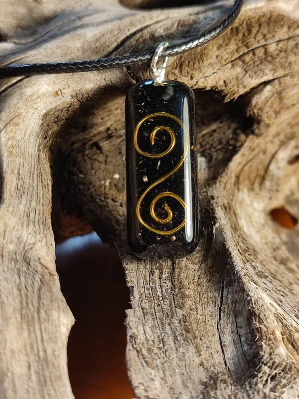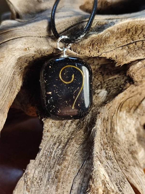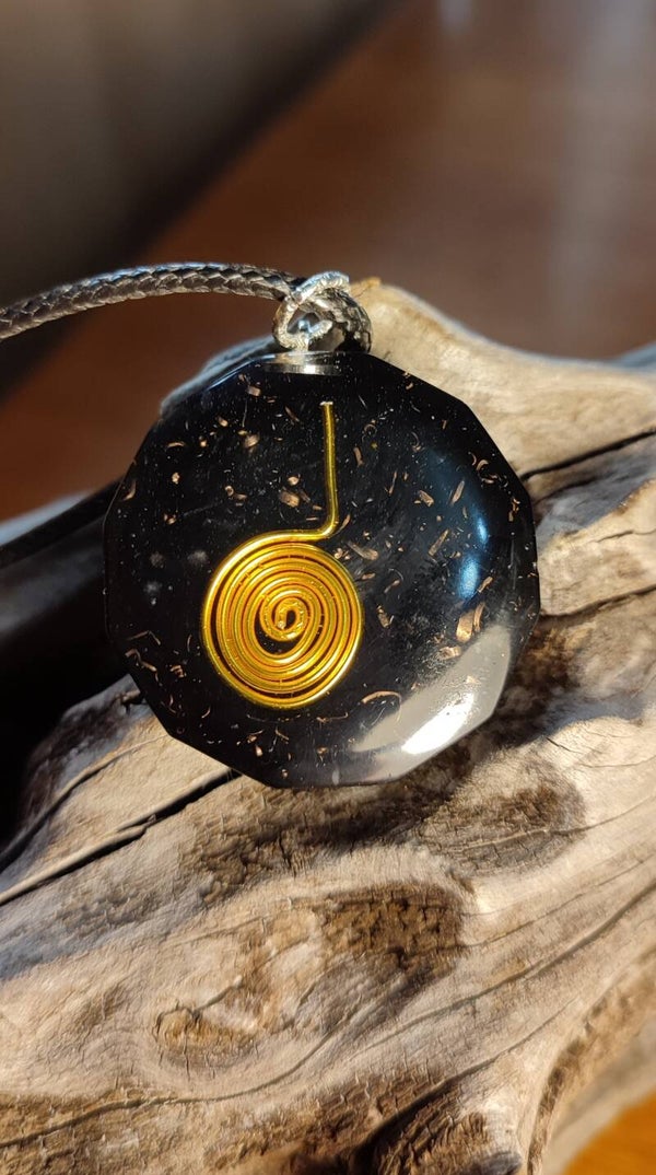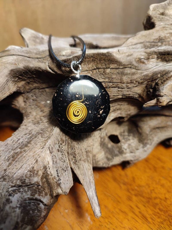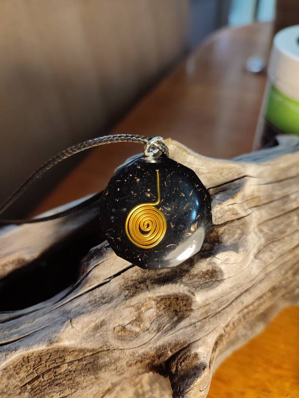 Black Tourmaline Organire pendants are made from pure Black Tourmaline powder, crystal chips, and copper filings, bound together with resin.