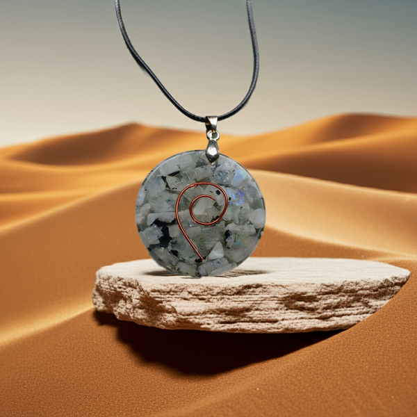 This pendant is hand-made from raw Rainbow Moonstone Crystals and bound together with resin, has a copper coil, and comes with a black cord.