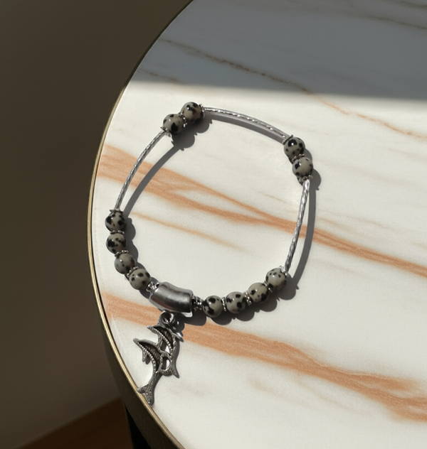 Handcrafted Natural 6mm Dalmation Stone necklace and matching bracelet. It is made with silver-coloured metal spacers, and the bracelet is elastic for a comfortable fit.
